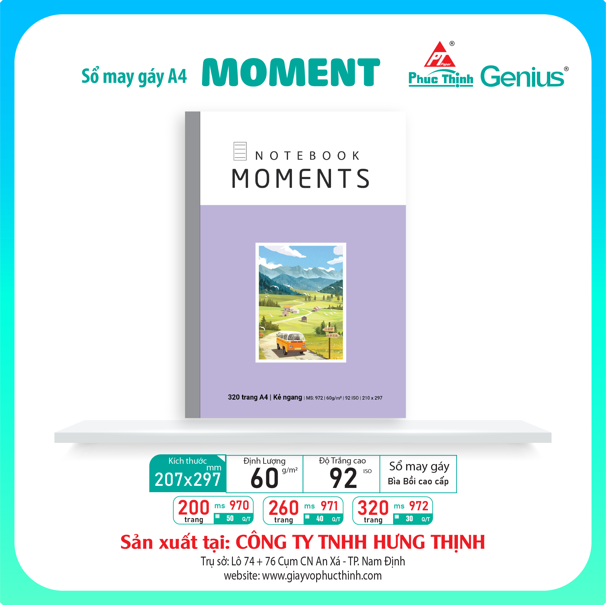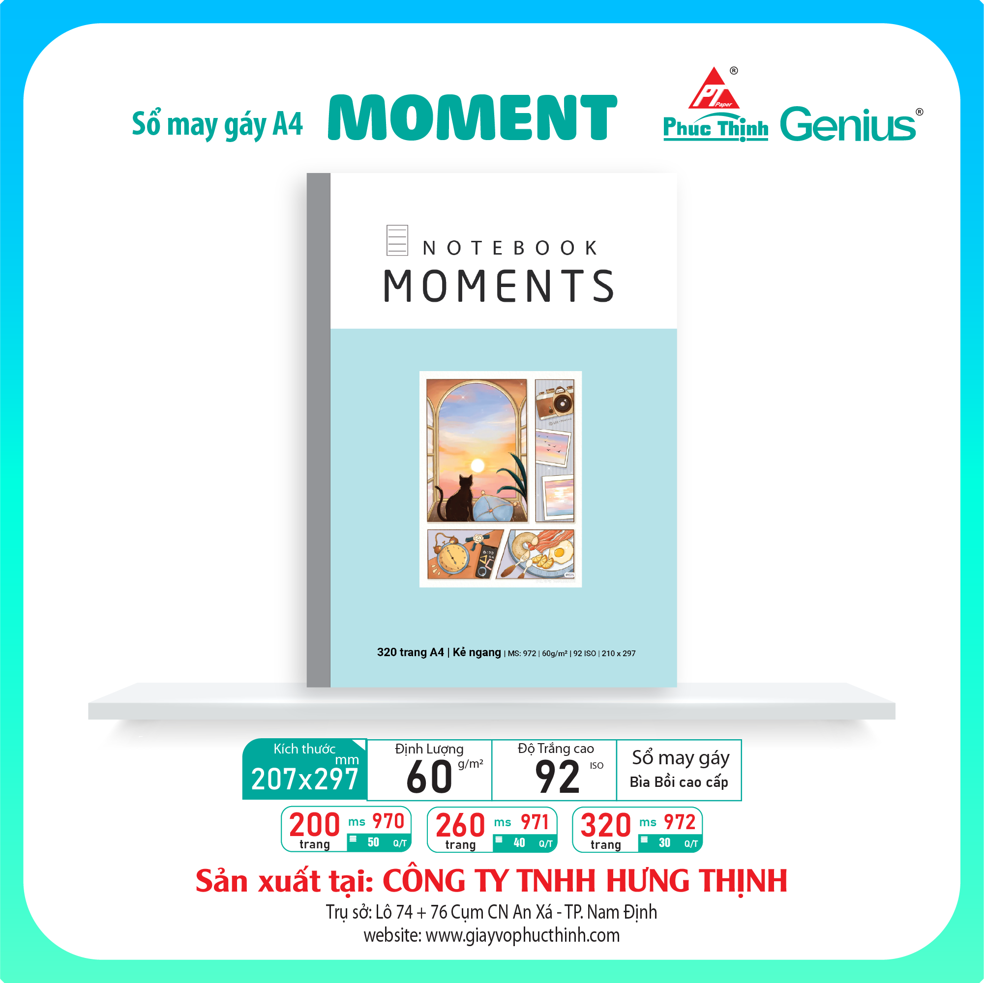 Vở MOMENTS – Ghi lại khoảnh khắc, mở rộng tri thức Dòng Vở A4 MOMENTS mang đến trải nghiệm học tập đầy cảm hứng với thiết kế bìa nghệ thuật, lấy cảm hứng từ thiên nhiên, cảnh quan và cuộc sống thường nhật. Đây là sản phẩm cao cấp từ thương hiệu Genius – Phúc Thịnh, thuộc Công ty TNHH Hưng Thịnh – đơn vị chuyên sản xuất giấy vở học sinh từ năm 2002.