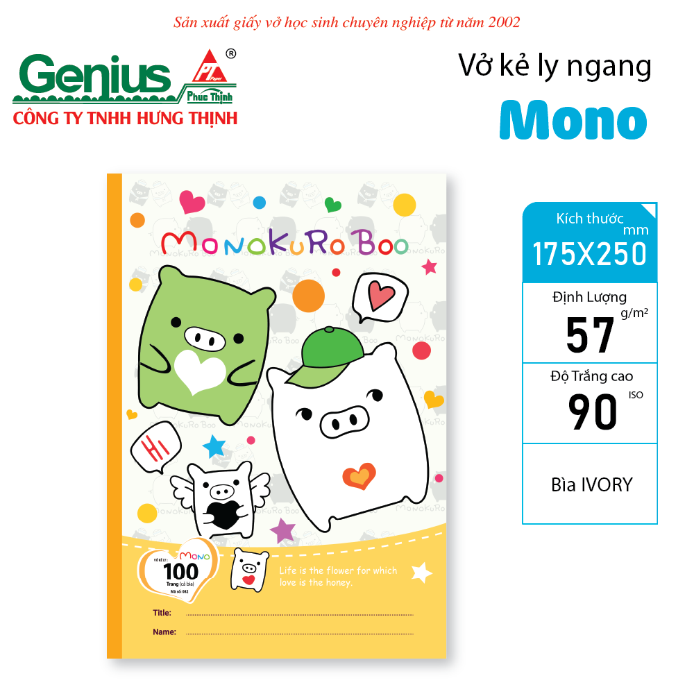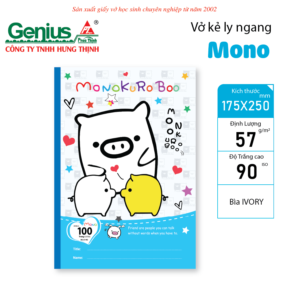 Vở MONO – Cá tính học đường, phong cách dễ thương Mang đến sự tươi mới và năng lượng tích cực cho mỗi tiết học với dòng vở thép kẻ ly ngang MONO, sản phẩm nổi bật từ thương hiệu Genius – Phúc Thịnh, thuộc Công ty TNHH Hưng Thịnh – đơn vị chuyên sản xuất giấy vở học sinh từ năm 2002.