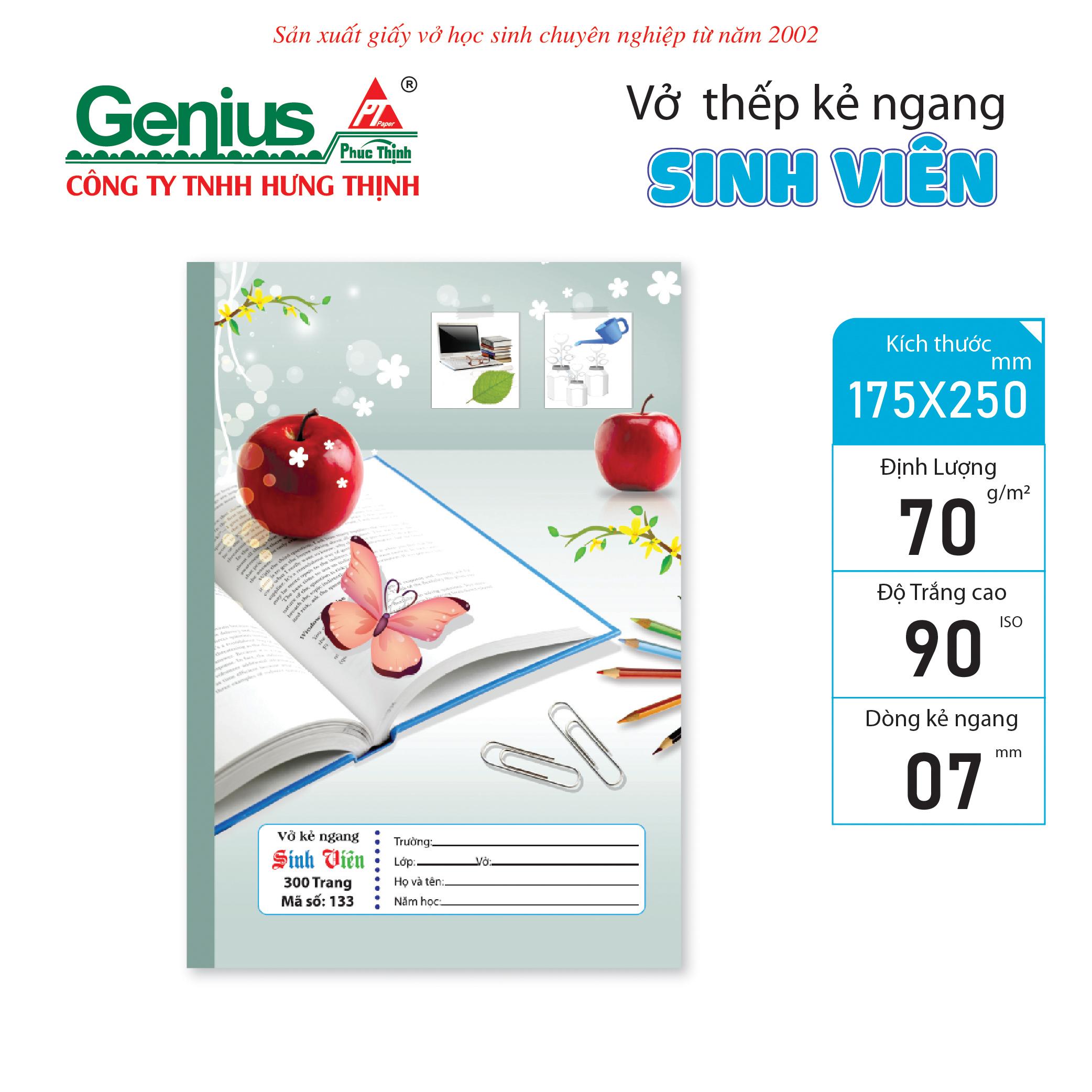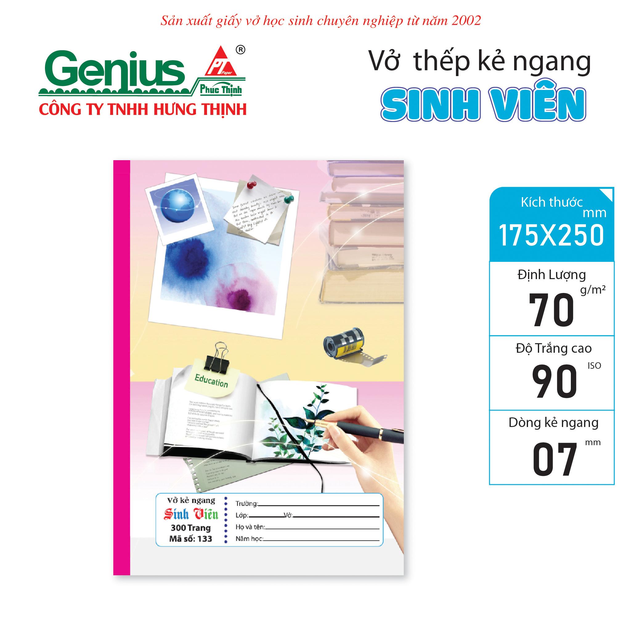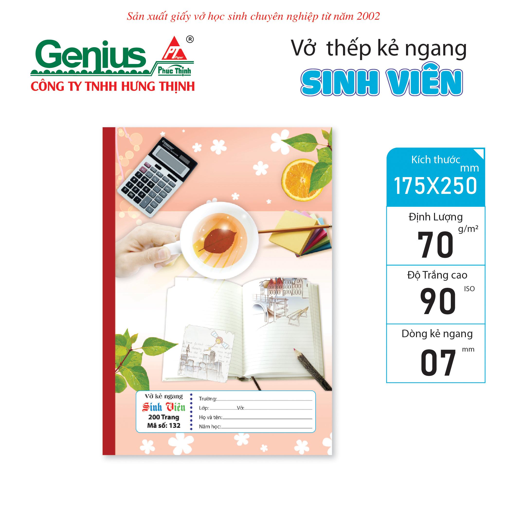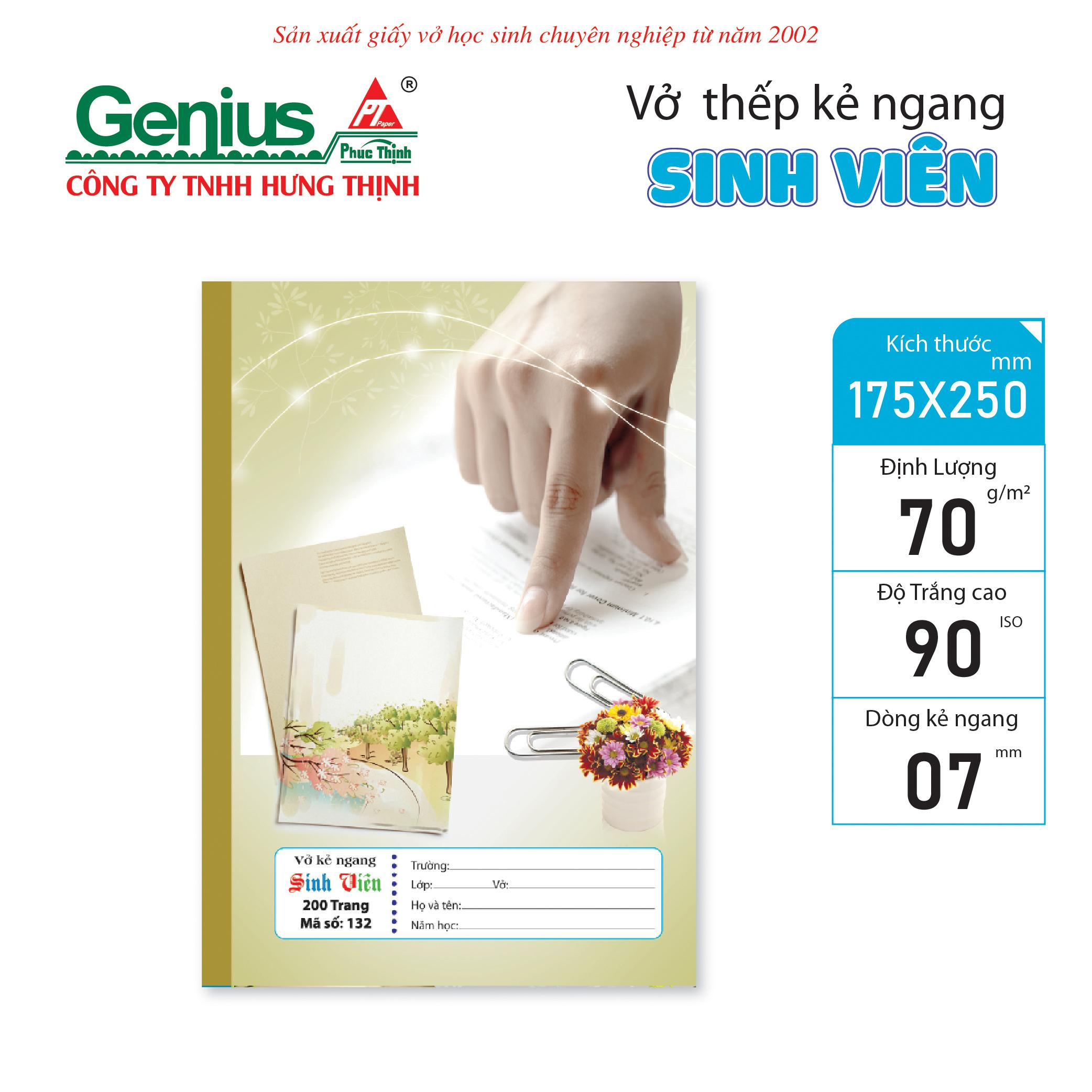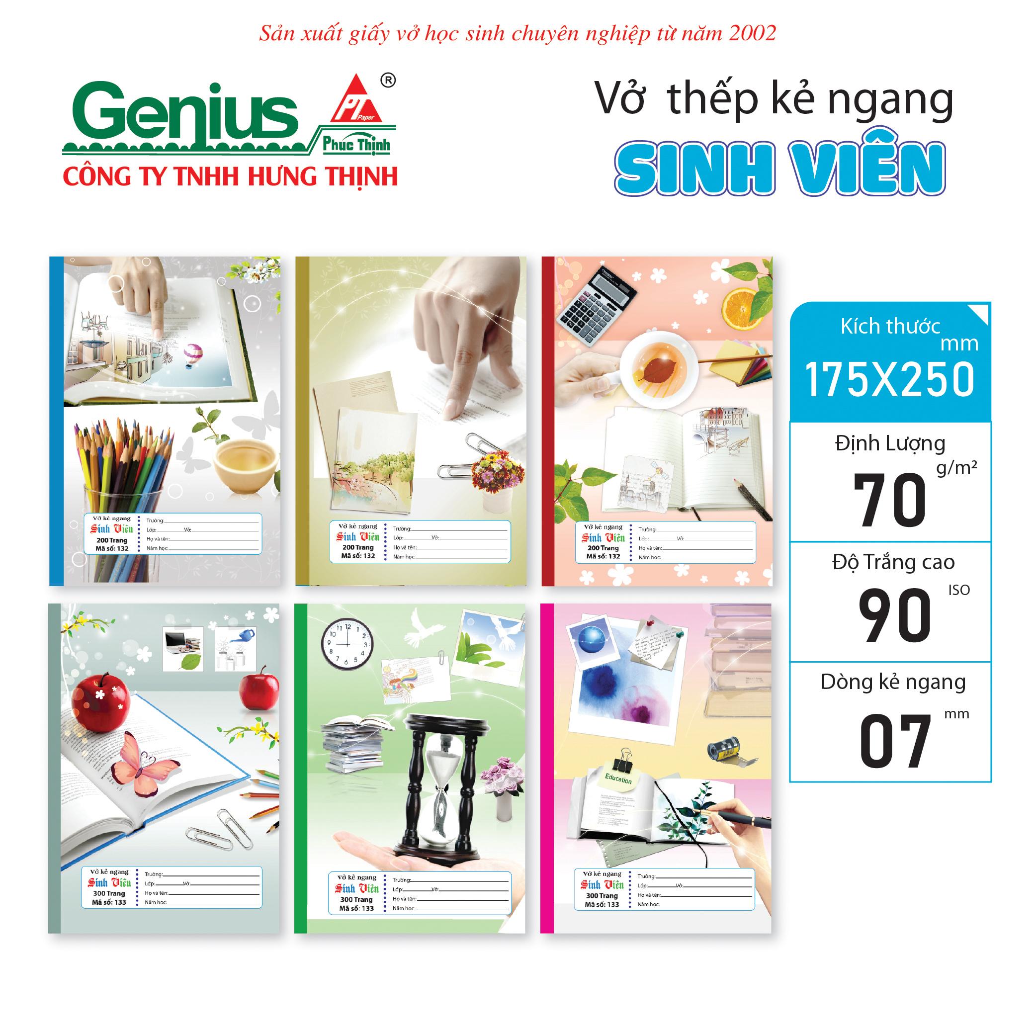 Vở Sinh Viên – Ghi chép chuyên nghiệp, đồng hành học thuật Dòng Vở Sinh Viên được thiết kế dành riêng cho học sinh, sinh viên và người đi làm cần ghi chép nhiều, với chất lượng giấy vượt trội và thiết kế bìa trang nhã, hiện đại. Đây là sản phẩm cao cấp từ thương hiệu Genius – Phúc Thịnh, thuộc Công ty TNHH Hưng Thịnh – đơn vị chuyên sản xuất giấy vở học sinh từ năm 2002.